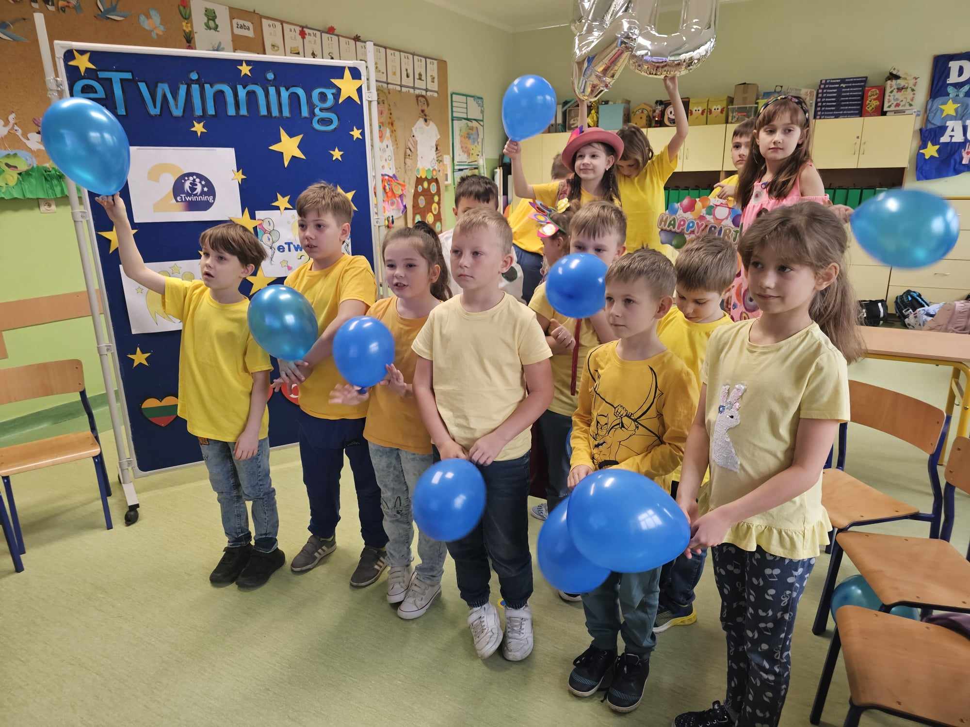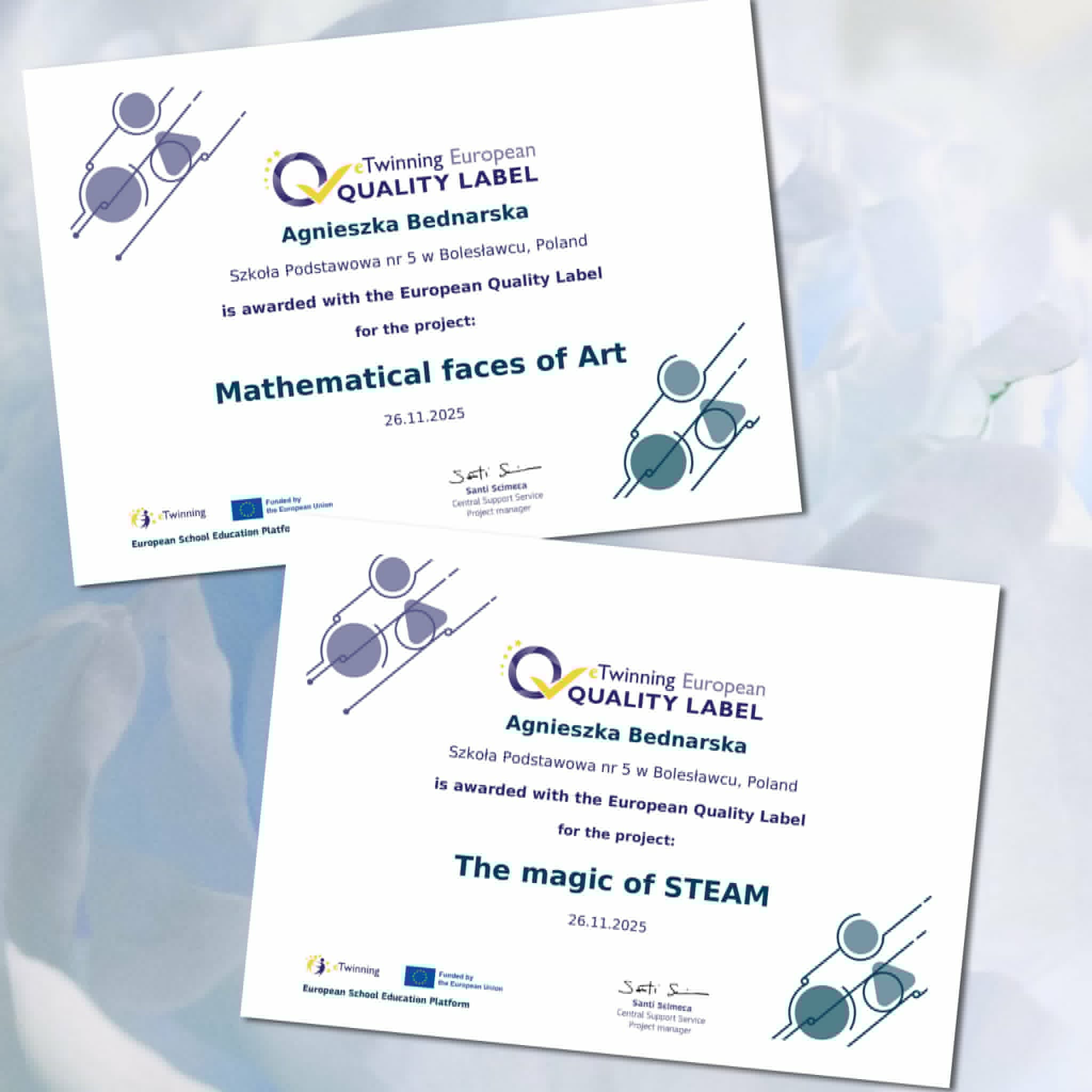EUROPEJSKIE ODZNAKI JAKOŚCI DLA PROJEKTÓW ETWINNING W roku szkolnym 2024/2025 wspólnie z uczniami klasy 1a oraz znakomitymi partnerami międzynarodowymi realizowaliśmy dwa inspirujące projekty eTwinning: „The magic of Steam” (celem projektu było pobudzanie zainteresowania nauką oraz kształtowanie postawy badawczej u dzieci poprzez integrację zagadnień z zakresu nauk, technologii, inżynierii, sztuki oraz matematyki (STEAM). Zastosowanie innowacyjnych, angażujących metod pracy umożliwiło uczniom podejmowanie działań opartych na eksperymencie, twórczym myśleniu i samodzielnym odkrywaniu, co sprzyjało łączeniu edukacji z elementami zabawy). „Mathematical faces of Art” ( której zadaniem było połączenie dwóch obszarów – matematyki i sztuki. Dzieci wyruszyły w pasjonującą przygodę, podczas której matematyka nabrała atrakcyjnego wymiaru, a sztuka odsłoniła swoje geometryczne i logiczne aspekty. Działania projektowe motywowały do obserwacji, odkrywania i tworzenia, kształtując u najmłodszych postawy badawcze, kreatywność oraz wrażliwość artystyczną). Oba przedsięwzięcia zostały docenione i nagrodzone Europejskimi Odznakami Jakości. W skali całego kraju wyróżnienie to otrzymało 350 nauczycieli. Serdecznie podziękowania dla wszystkich członków zespołu projektowego, a w szczególności dla współzałożycielek– Doroty Stanałowskiej oraz Nursel İgaç – za ogromne zaangażowanie, entuzjazm i twórczą energię. Słowa wdzięczności należą się również uczniom z obecnej klasy 2a, ponieważ ten sukces jest efektem naszej wspólnej pracy.