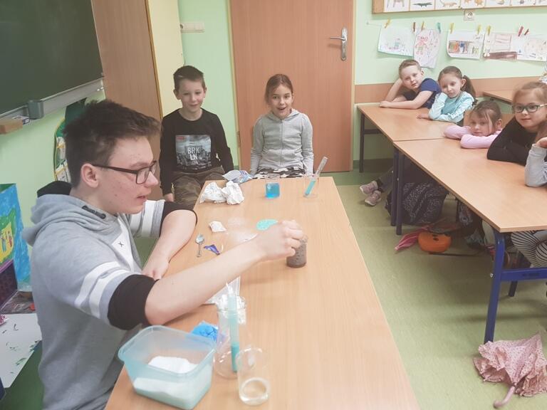 Podczas spotkania z pierwszakami Kacper pokazywał proste, bezpieczne i ciekawe doświadczenia chemiczne. Dzieci z zapartym tchem obserwowały, co dzieje się ze zmieszanym wodorowęglanem sodu i kwasku cytrynowego, jak zachowuje się po zmieszaniu go z wodą. Mogły zobaczyć co dzieje się, gdy chlorek sodu połączymy z siarczanem (VI) miedzi (II). Działo się dużo, doświadczeń było wiele…. Dzieci były zachwycone reakcjami, jakie zachodziły w probówkach. Fantastyczna sprawa, gdy starszy kolega dzieli się swoją wiedzą z młodszymi kolegami. Dziękujemy.