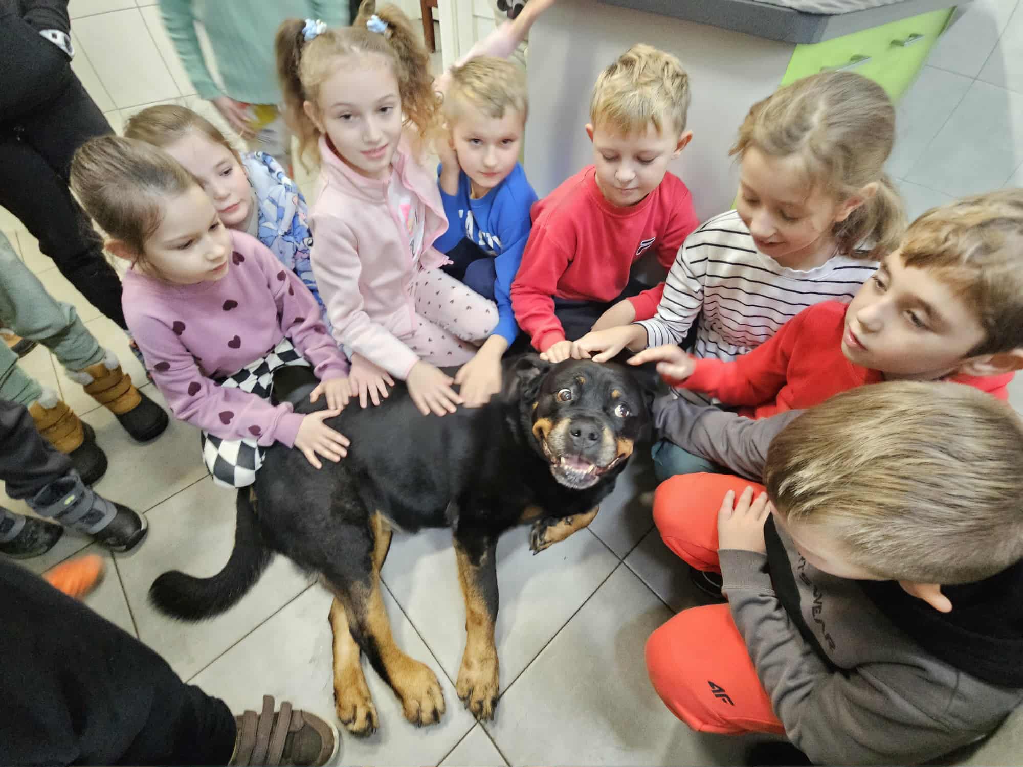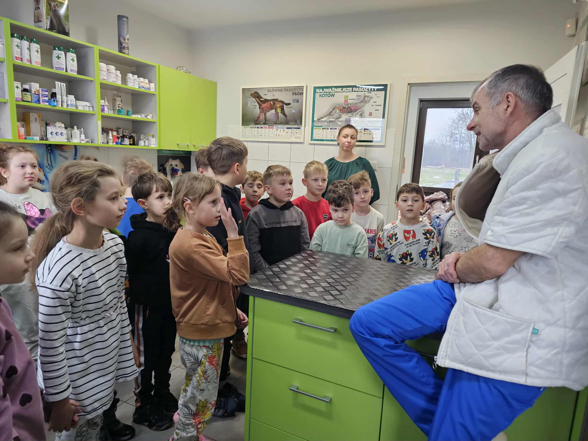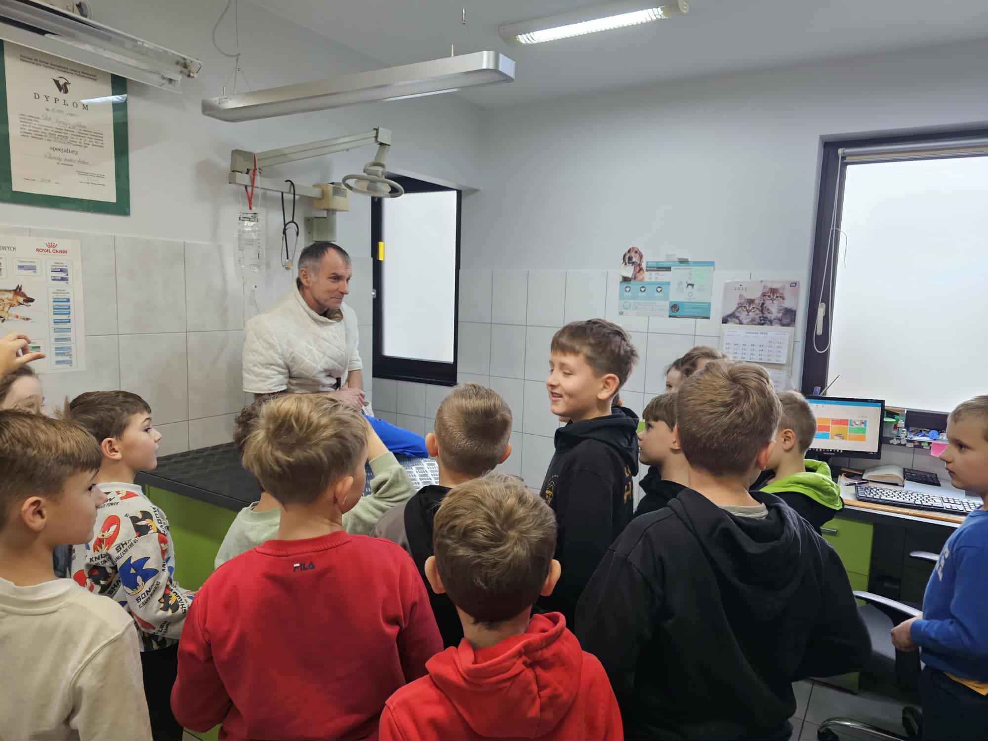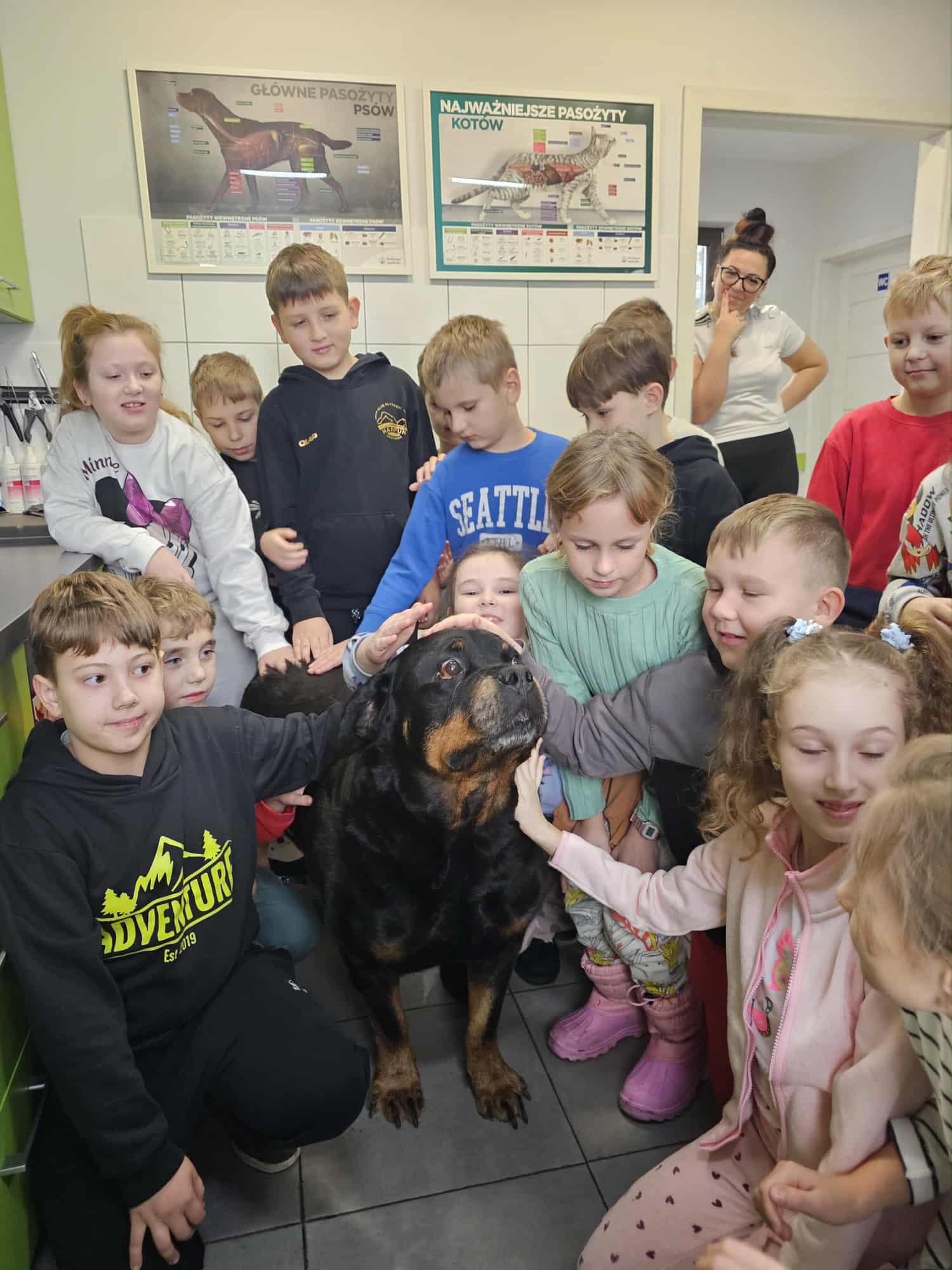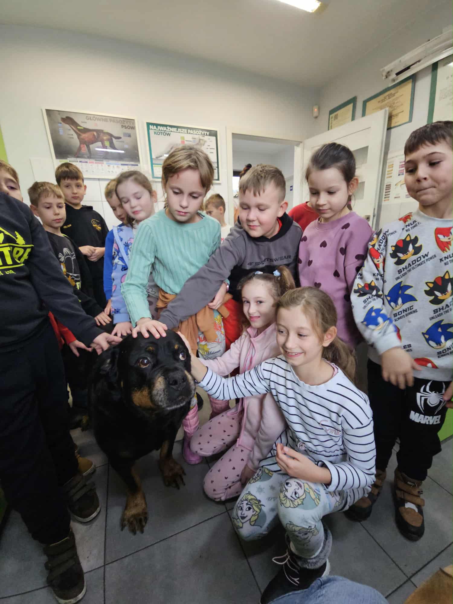 W poniedziałek uczniowie klasy 2a odwiedzili gabinet weterynaryjny pana Piotra Klasy. Drugoklasiści dowiedzieli się, czym na co dzień zajmuje się weterynarz, a także jakie obowiązki wiążą się z jego pracą. Pan doktor przypomniał dzieciom o odpowiedzialności właścicieli zwierząt. Zwrócił uwagę na znaczenie profilaktyki, między innymi regularnego odrobaczania zwierząt wychodzących na zewnątrz oraz corocznego szczepienia przeciwko wściekliźnie. Wyjaśnił też, jak należy zachować się w przypadku spotkania dzikiego zwierzęcia, które nie ucieka przed człowiekiem. Dzieci miały także okazję dowiedzieć się do czego służy chip, jak wygląda i jakie znaczenie ma dla bezpieczeństwa zwierząt. Dużo radości sprawiła uczniom obecność suczki pana doktora. Uczniowie chętnie ją głaskali i przytulali, a Koki z łagodnością i czułością odwzajemniała ich sympatię. Wizyta była dla drugoklasistów ciekawą i pouczającą lekcją, dzięki której lepiej poznali pracę weterynarza oraz zasady właściwej opieki nad zwierzętami.